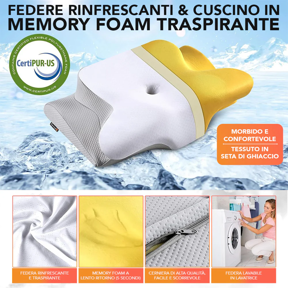 Κατασκευασμένο από memory foam, αγκαλιάζει απαλά το κεφάλι σου προσφέροντας μια απαλή και δροσερή εμπειρία ύπνου σαν σύννεφο.